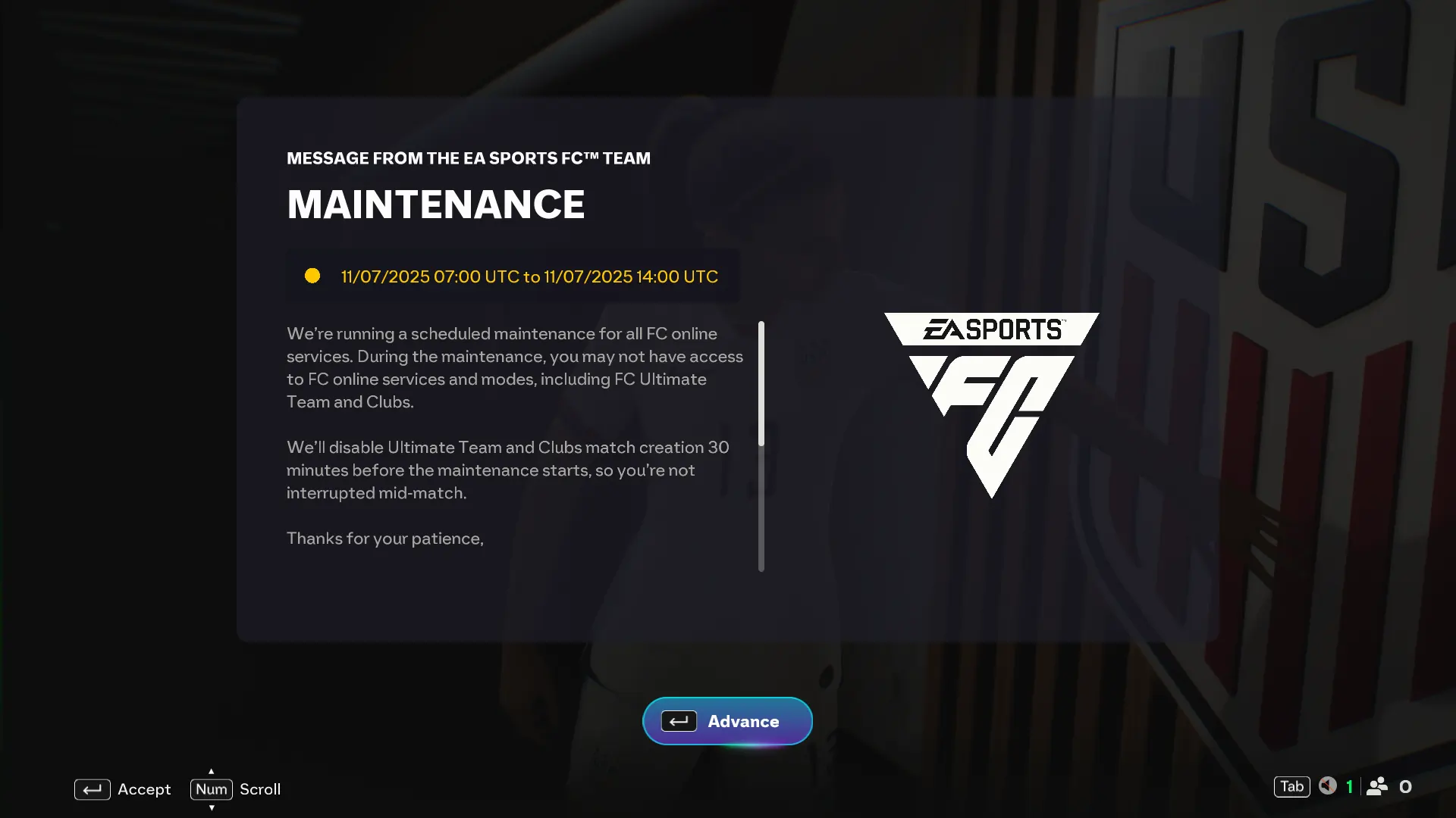 EA FC 26 Maintenance on 7 November 2025