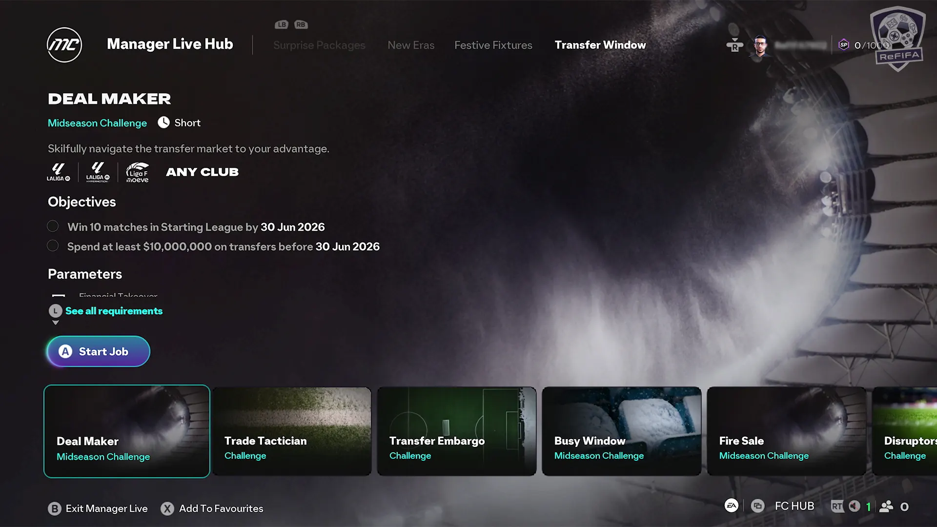 Deal Maker: Play with any club in LaLiga EA SPORTS, LaLiga Hypermotion, or Liga F Moeve and prove you can navigate multi-market deals. This long challenge asks you to balance buying power, timing and clever negotiation to build a competitive squad across Spanish competitions.