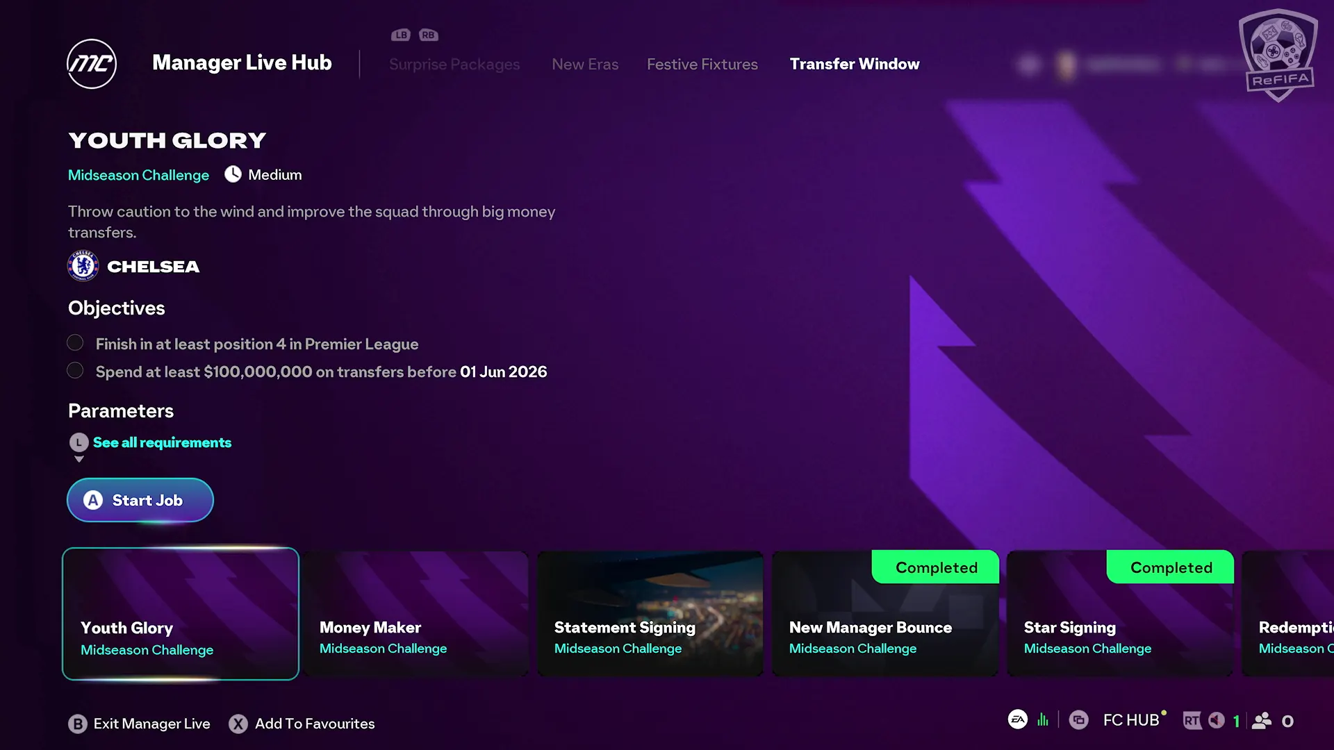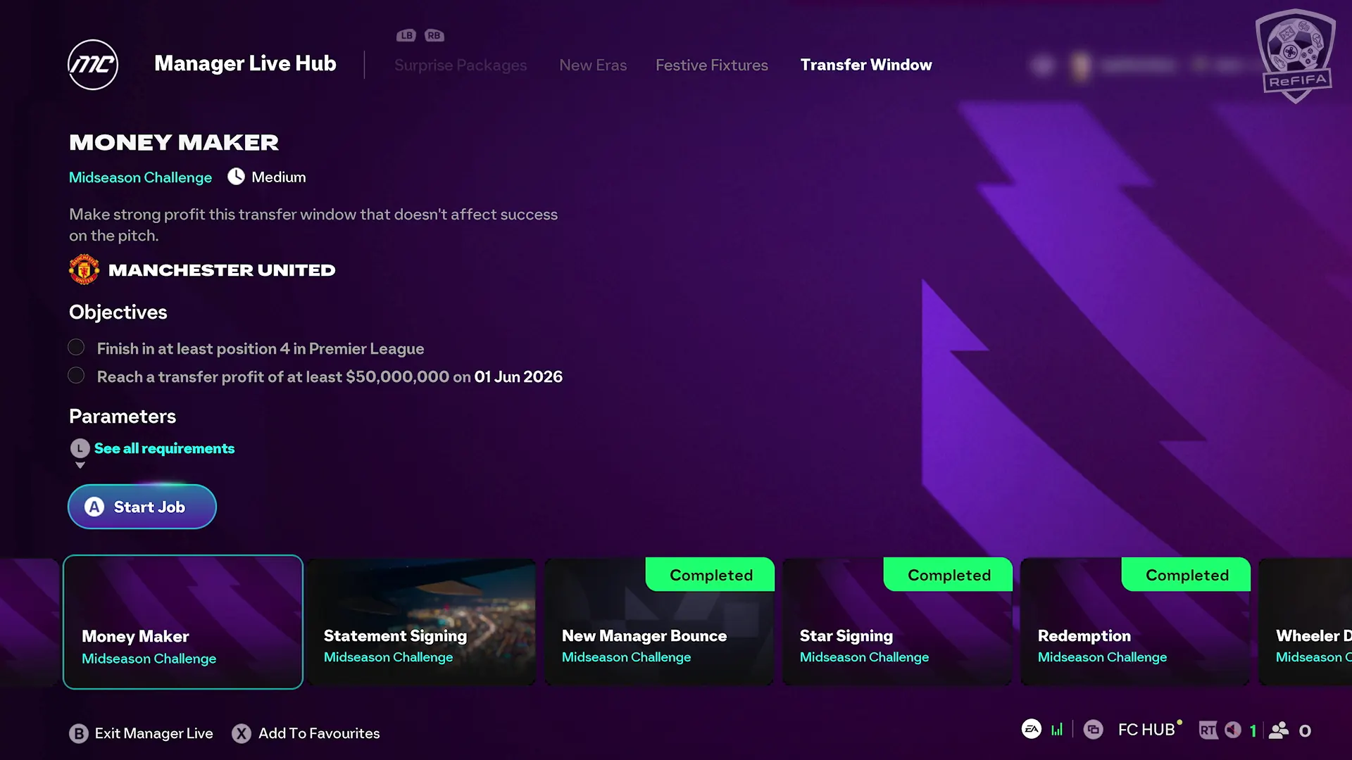 The Manager Live Hub now includes three new, transfer-centric challenges you can start from the Transfer Window tab.