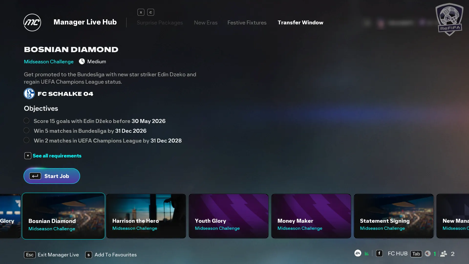 Sign veteran Edin Džeko, take Schalke to the Bundesliga and push back into Champions League football. This challenge blends promotion objectives with continental ambitions.