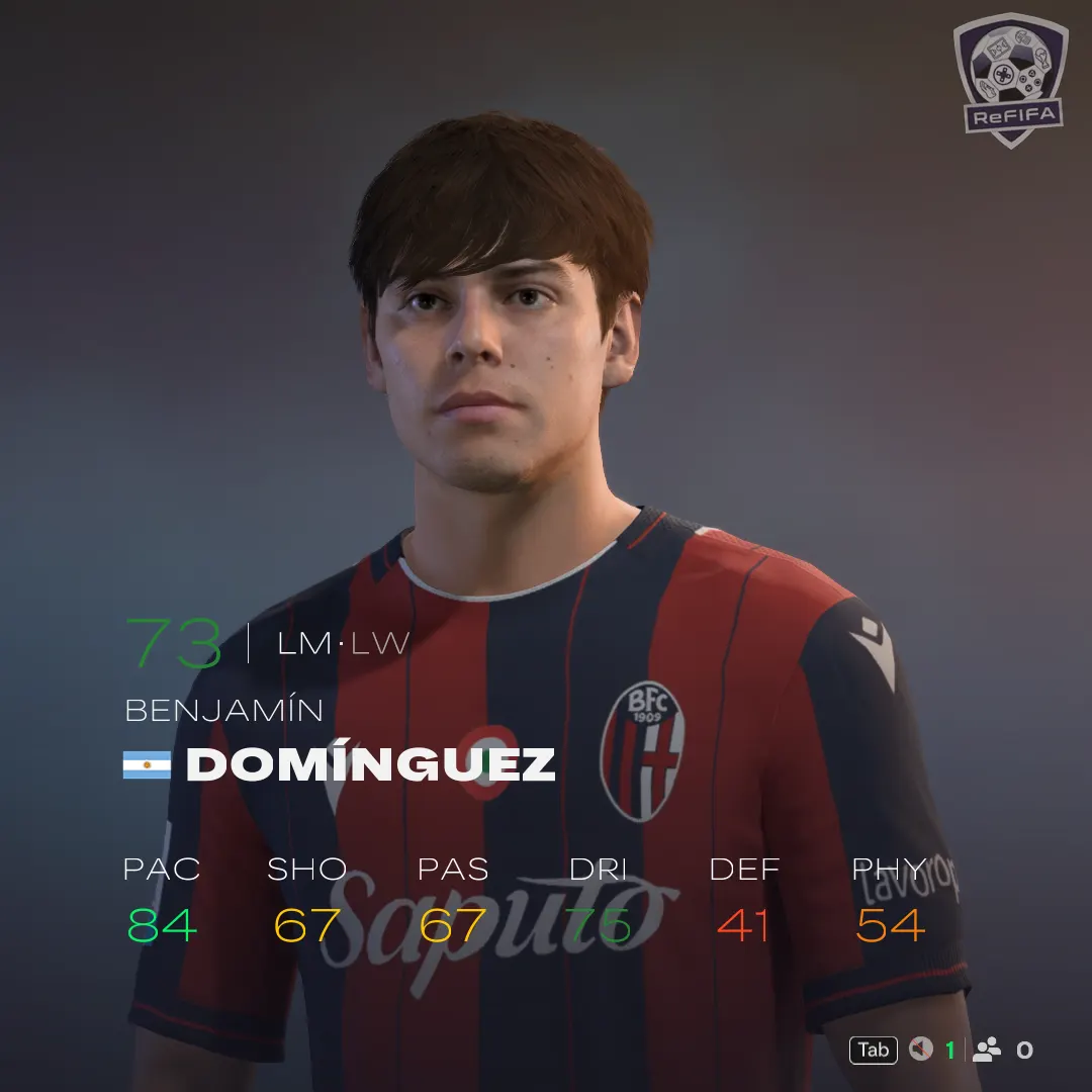 Another Bologna gem, Domínguez is an Argentine attacking midfielder or winger with flair and pace. At 21, he has a 73 overall and can rise to 83 potential.