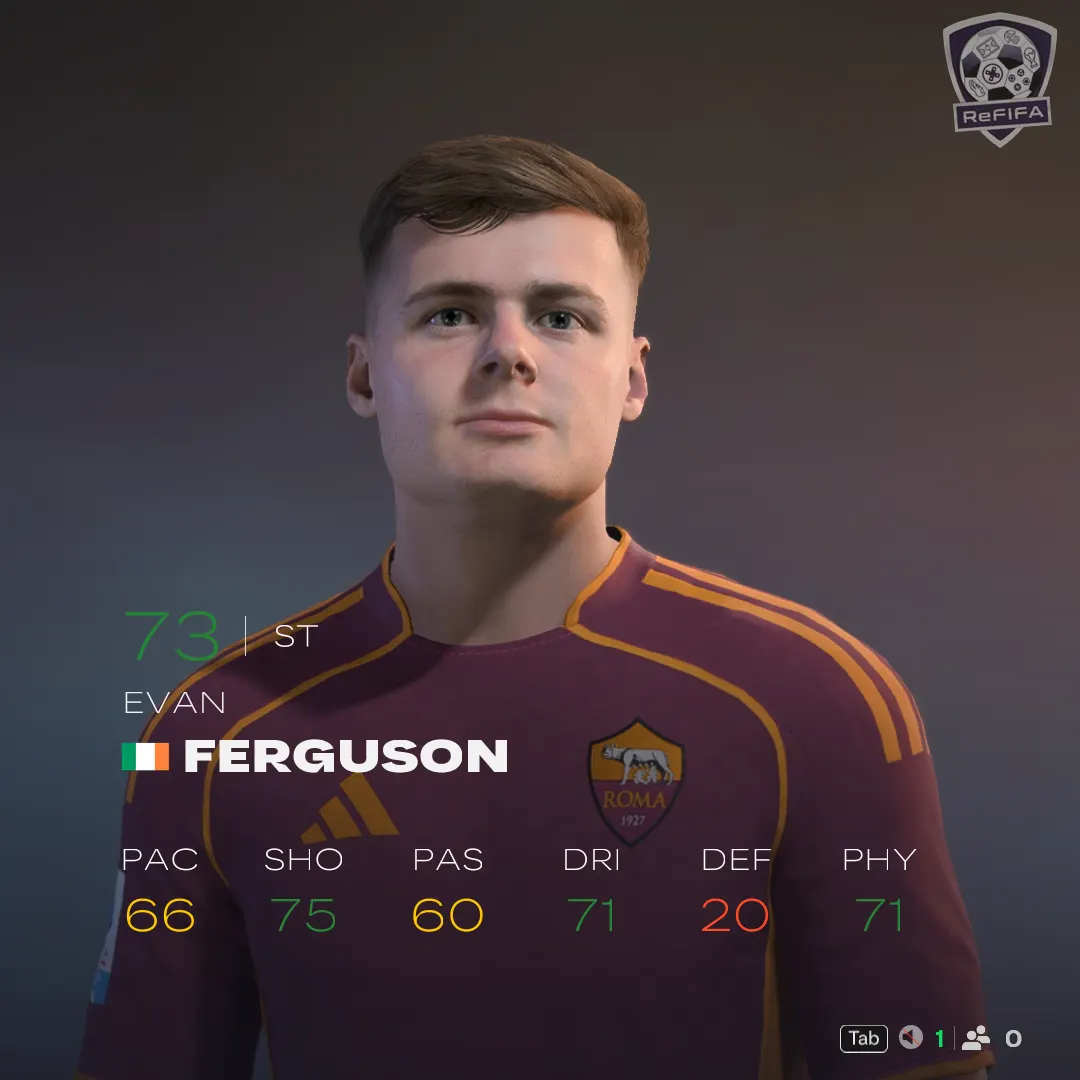 Ferguson, only 20 years old, leads Roma’s line with power and precision. The Irish striker starts at 73 overall and can grow to 82 potential.