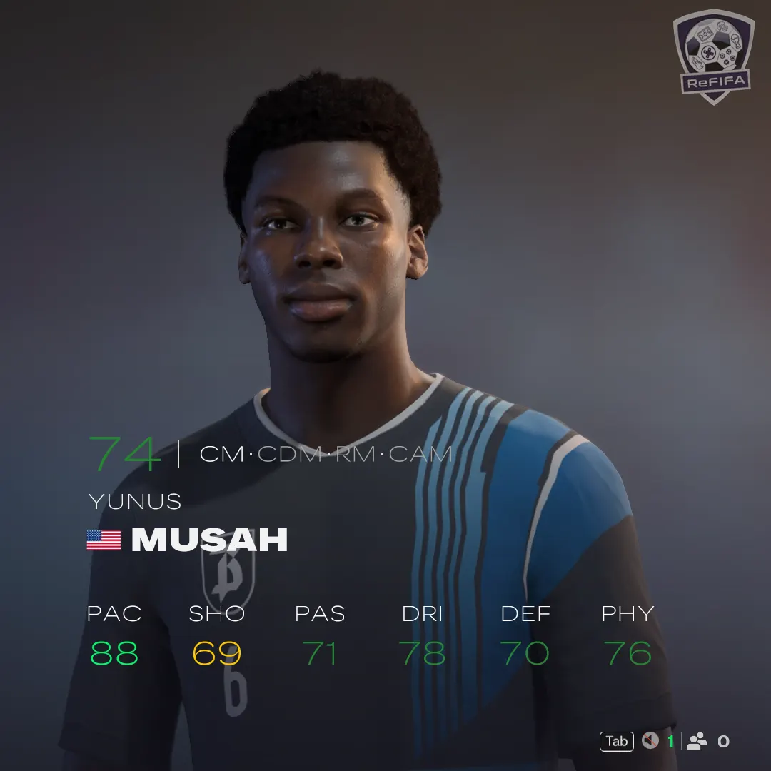 Musah continues his development in Serie A as a dynamic midfielder. At 22, he can operate as CDM, RM, or CAM with a 74 overall and 82 potential.