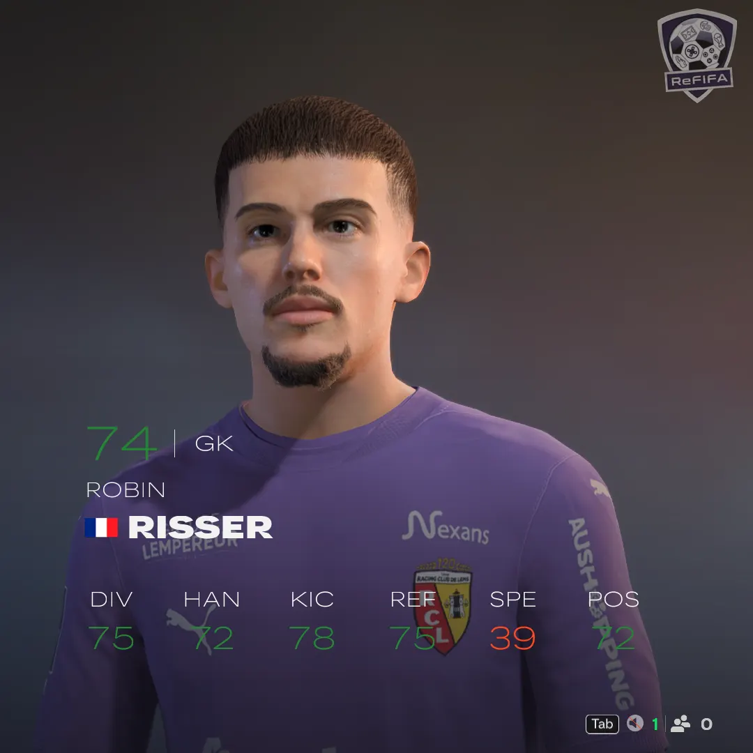 Robin Risser (RC Lens – Ligue 1) brings a strong 74 Overall Rating at only 20 years old, paired with 82 Potential.